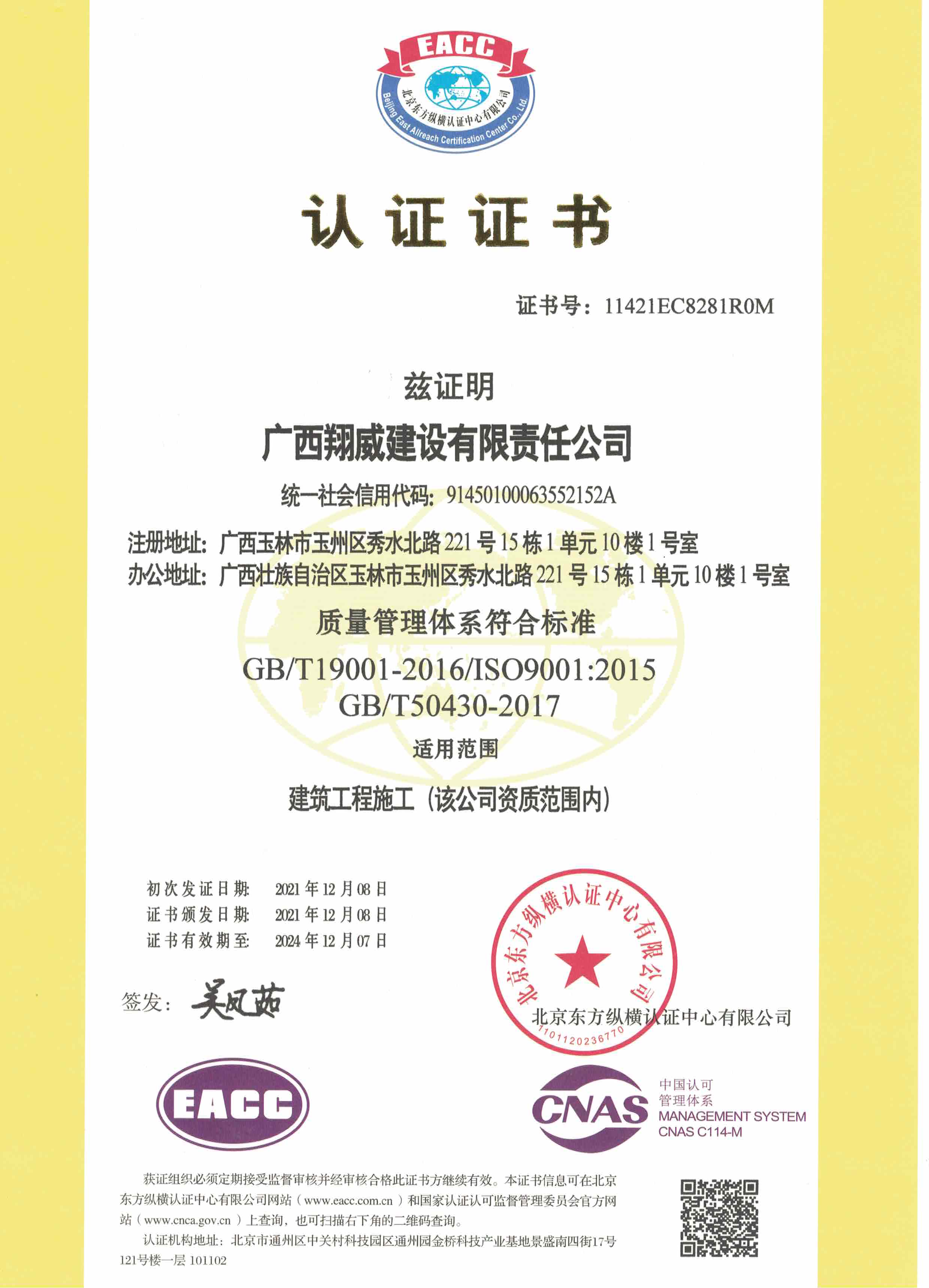 质量管理体系认证证书